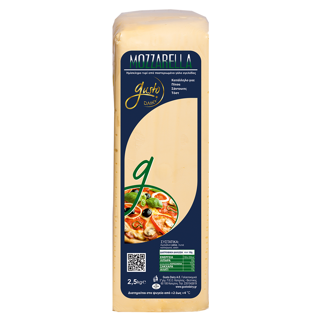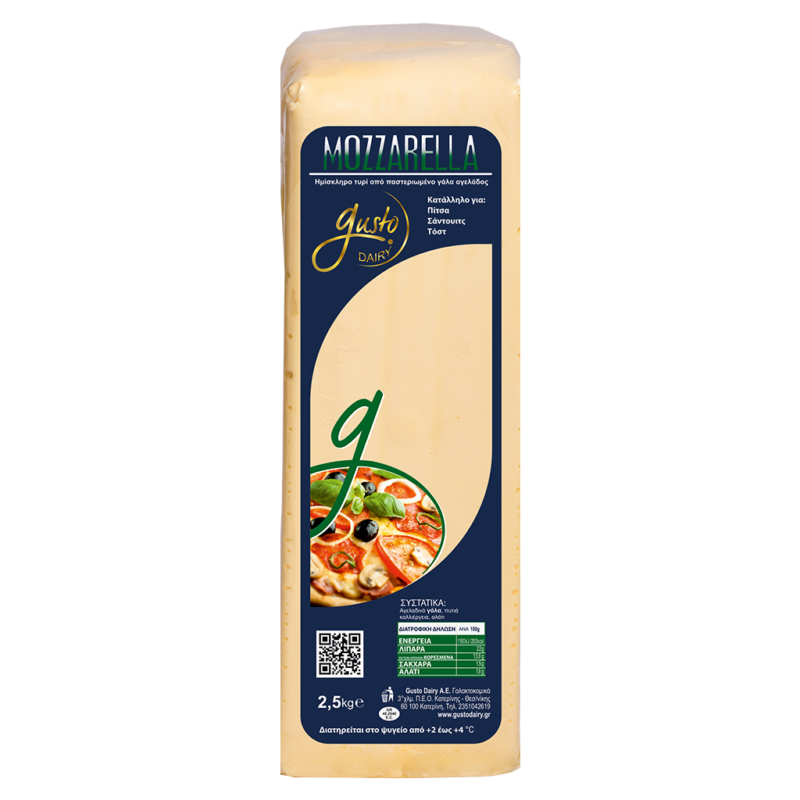 Η Mozzarella είναι ένα ακόμα προϊόν της Gusto Dairy, πλούσιο σε γεύση που παράγεται από 100% αγελαδινό γάλα. Το χρώμα της είναι κρεμώδες λευκό, ενώ έχει απαλή γεύση και χαρακτηριστική μυρωδιά. Είναι κατάλληλο κυρίως για τη χρήση σε παρασκευή πίτσας, αφού λιώνει υπέροχα και δίνει μοναδική και πλούσια γεύση. Χρησιμοποιείται και ως συστατικό σε σαλάτες καθώς επίσης σε κρύα αλλά και ζεστά σάντουιτς.